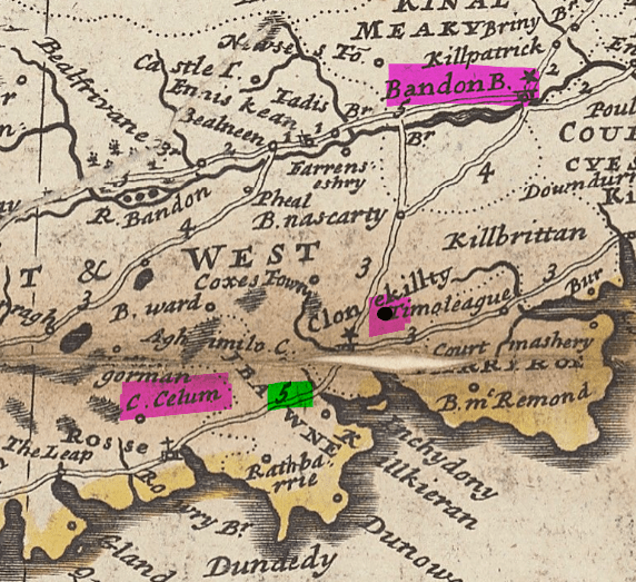 This clip from the 1714 map shows the places mentioned with John’s castle indicated by the black dot highlighted in pink to the left of the word Timoleague. The milage is highlighted in green. Castlesalem is refered to as C. Celum.